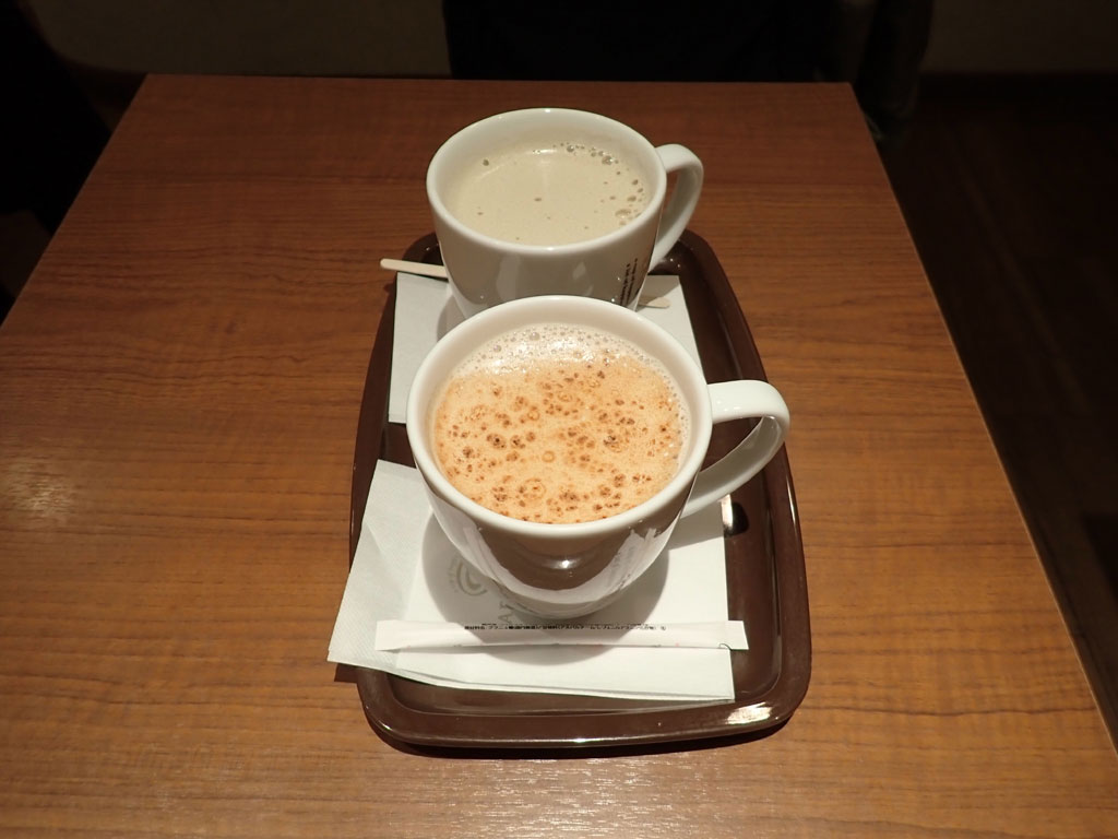 人形町付近に到着したら、ひとまずカフェドクリエに入って一休み。手前がチャイティーラテ、奥がほうじ茶ラテ。