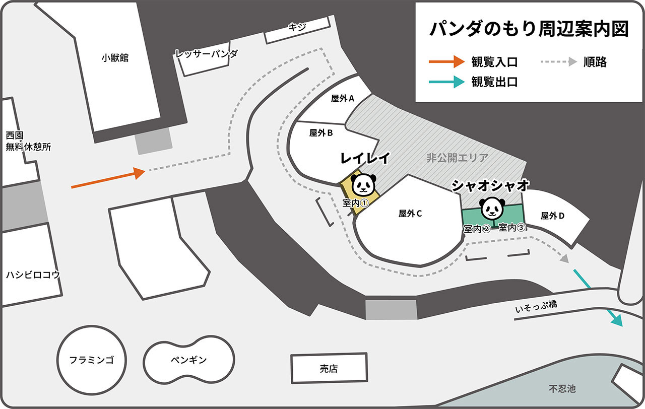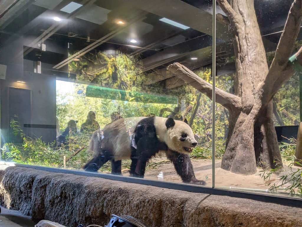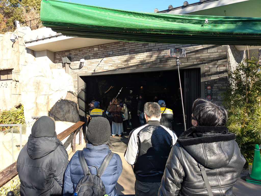 長い行列を少しずつ進み、パンダ舎に到着。十数人でグループ分割して見学となるようだ。1分程度でチャイムが鳴って移動をする感じ。案内の人は引き剥がしが大変そう。